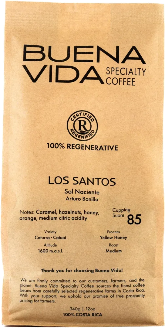 From Costa Rica’s Los Santos region at 1,600 m.a.s.l., this Yellow Honey Caturra–Catuaí from Sol Naciente delivers a sweet and balanced cup, with notes of caramel, hazelnuts, honey, and orange, complemented by medium citric acidity.